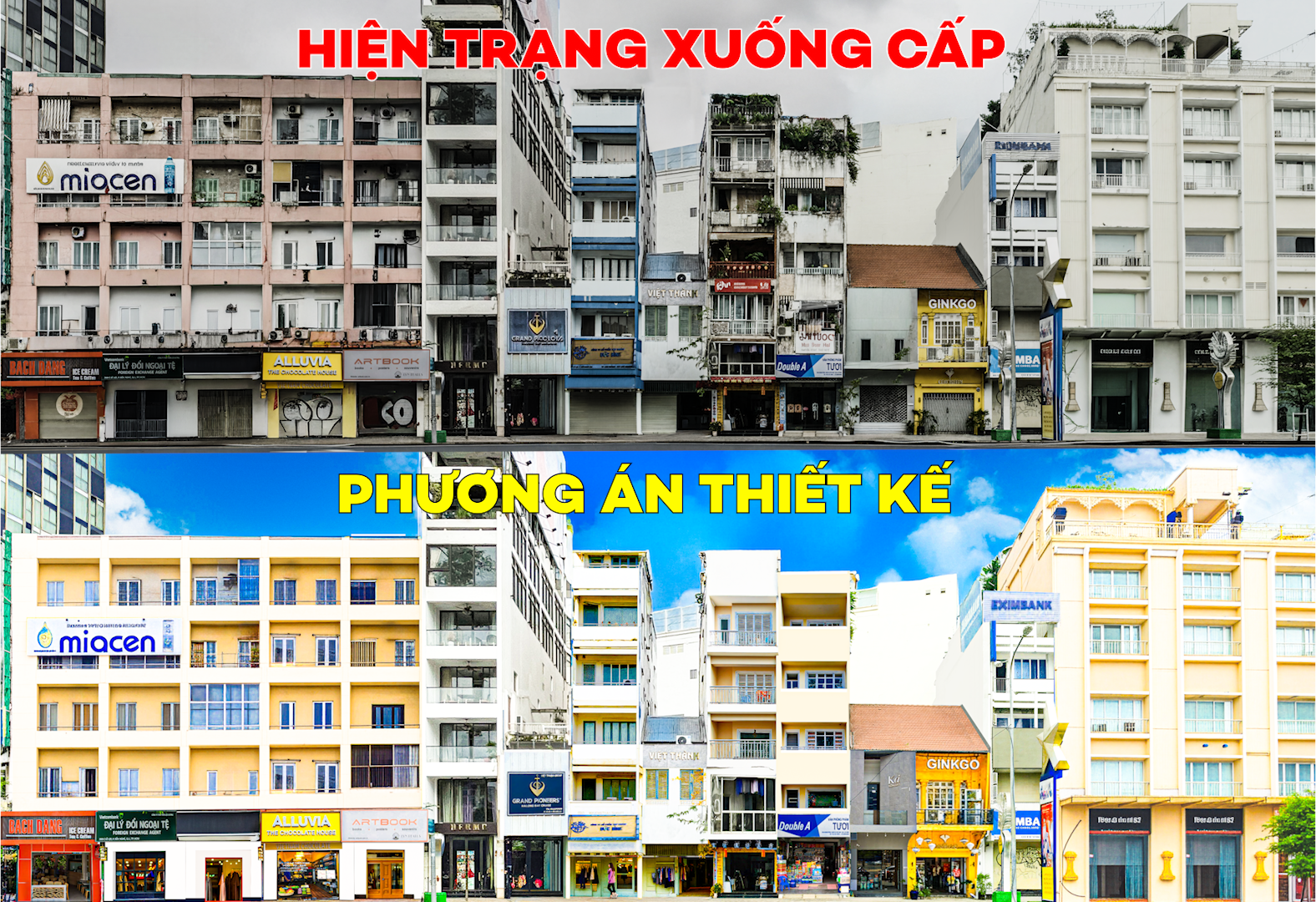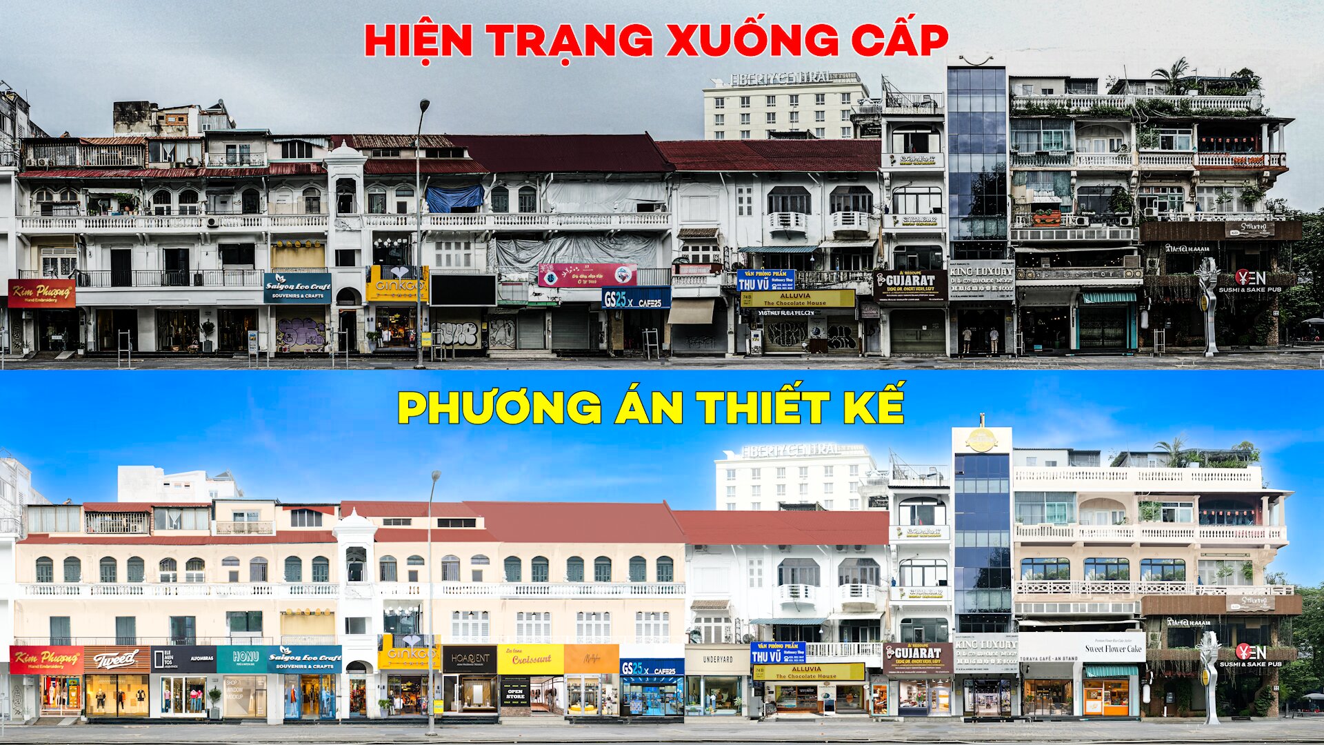 Công trình khu vực Công trường Lam Sơn trước và sau khi chỉnh trang; mặt tiền dãy nhà được vệ sinh rong rêu, cây bụi bám và sơn mới với màu sắc hài hòa.