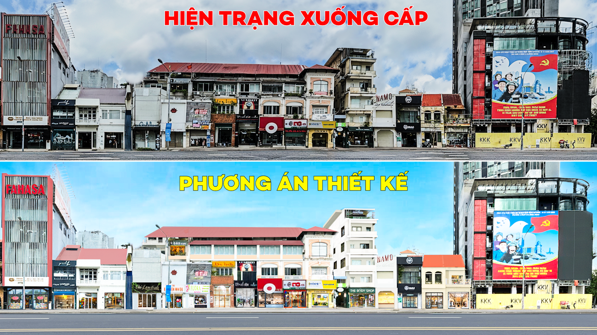 Các hạng mục chính bao gồm sơn mới, chỉnh trang mặt đứng các công trình hai bên tuyến đường; cải tạo, vệ sinh và sắp xếp lại bảng hiệu theo quy chuẩn; lát đá granite vỉa hè, dải phân cách; bổ sung mảng xanh và bồn hoa, nhằm tạo tổng thể không gian đô thị thống nhất, hiện đại nhưng vẫn tôn trọng bối cảnh kiến trúc hiện hữu.